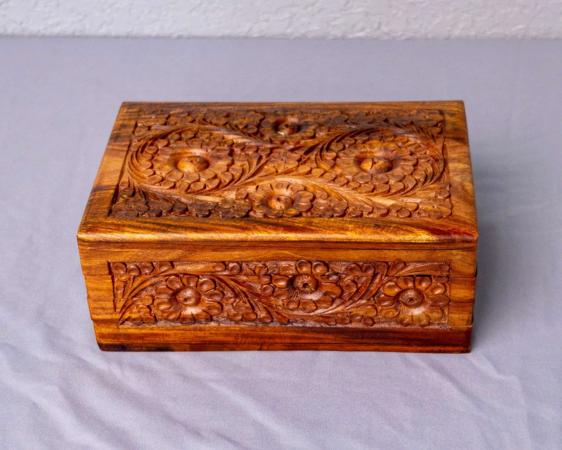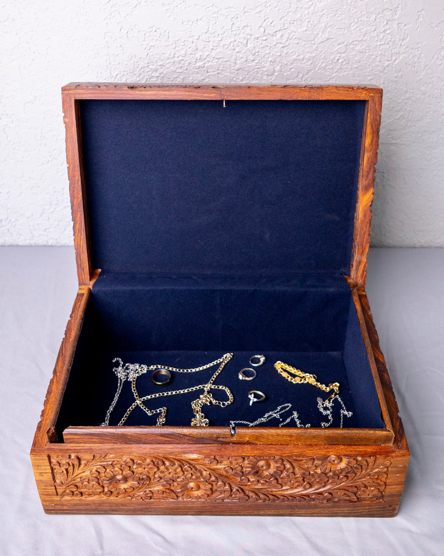 Every jewelry box is meticulously hand-carved, no lasers or CNC machines. Ever.
